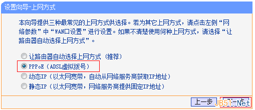 3、選擇上網方式:選擇“ PPPoE(ADSL虛擬撥號)”——>點擊“下一步”。