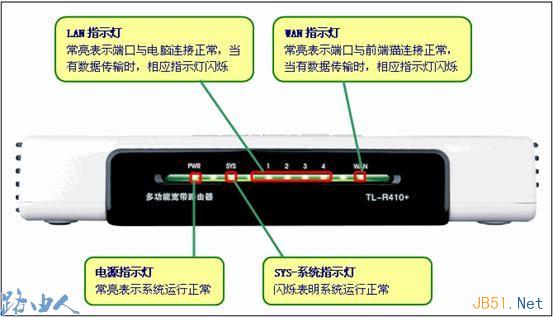 2、檢查指示燈,路由器運行正常情況下,電源指示燈(PWR)常亮,系統指示燈(SYS)閃爍,WAN端口以及LAN端口常亮或者閃爍。
