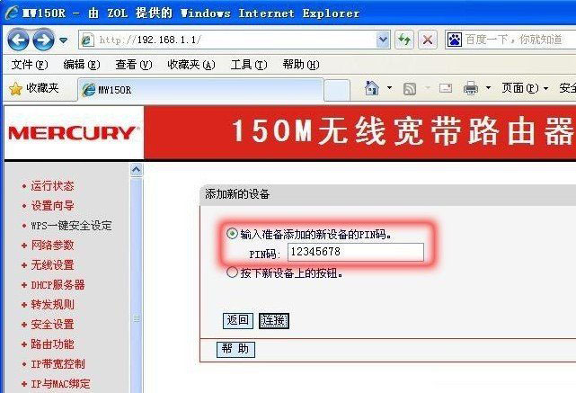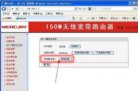 下面筆者以一實際無線路由器設置為大家通俗的講解下,本文以水星Mercury MW150R無線路由器為例,首先安裝好無線路由器,之后在IE瀏覽器地址欄中鍵入“192.168.1.1”,彈出用戶名和密碼對話框,水星的用戶名和密碼均為admin,鍵入后就會彈出無線路由器的配置界面。點擊“WPS一鍵安全設定”,即可獲取到它的PIN碼信息:08269164(如下圖)大家可以先用筆記下來,等下連接上網設備要用到,當然用到了再進路由器查看也可。