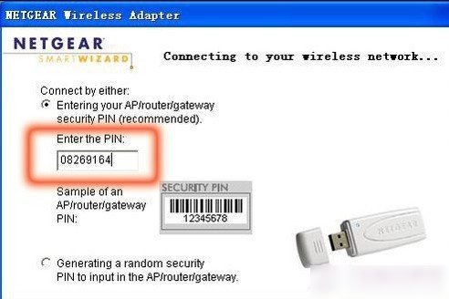 在新的界面中輸入NETGEAR WN111無線網卡的“PIN”碼,然后點擊“連接”。(注意:整個過程要在120秒內完成,否則會連接失敗,需要重試)
