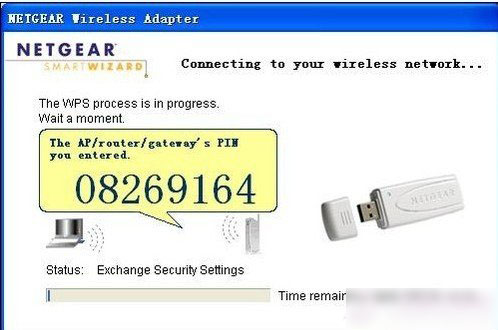 在上一頁中介紹到的NETGEAR WN111無線網卡的PIN加密界面鍵入“08269164”后,點擊“Next”進行下一步。會有如下圖彈出。