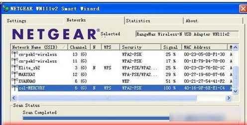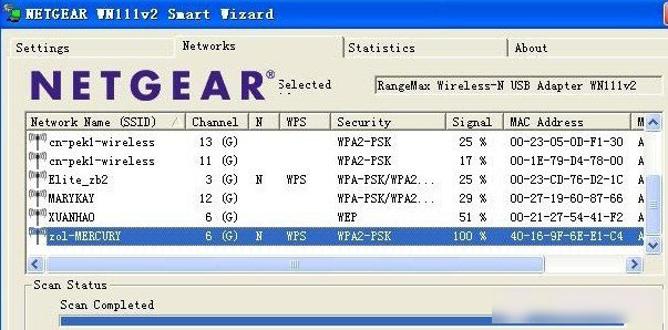首先,在電腦上插入NETGEAR WN111無線網卡,它自帶的安裝驅動程序會自動安裝,如下圖的無線網絡列表界面隨后彈出,刷新它,然后選擇需要你想連入的無線網絡名稱(SSID),比如本文以之前設置好的SSID為例,我選擇“zol-MERCURY”,雙擊它,如下圖。