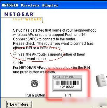 之后會會彈出如下圖樣的NETGEAR WN111無線網卡加密方式。NETGEAR WN111有兩種加密方式:PIN加密和按鍵加密。我們先來講講PIN加密法,如下圖。