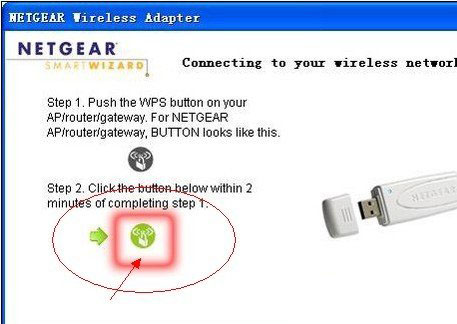 之后我們需要找到無線路由器WPS鍵,(一般在路由器中為紅顏色按鍵,有標注,請注意查看)按下“WPS”鍵后,我們會看到無線路由的WPS指示燈在一直閃爍。此時我們需要做什么?還要進入無線路由的Web界面嗎?當然不,我們要做的只是在2分鐘內回到提醒界面,用鼠標點擊下圖紅框內所示的圖標即可,否則需要重試。