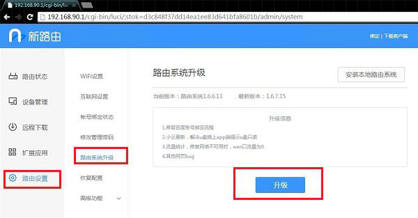 然后同樣是進入聯想newifi mini管理界面,進入【路由器設置】-選擇【路由器系統升級】,這里選擇【安裝本地路由系統】,如下圖所示。