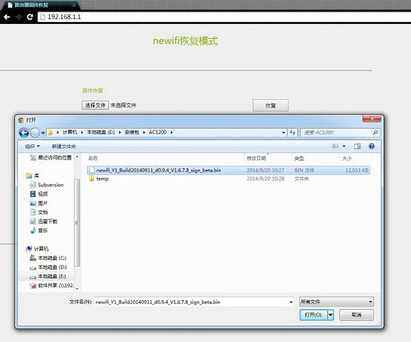 最后通過瀏覽的方式,找到我們自家下載的適配固件,打開之后即可進行聯想newifi mini固件升級,如下圖所示。