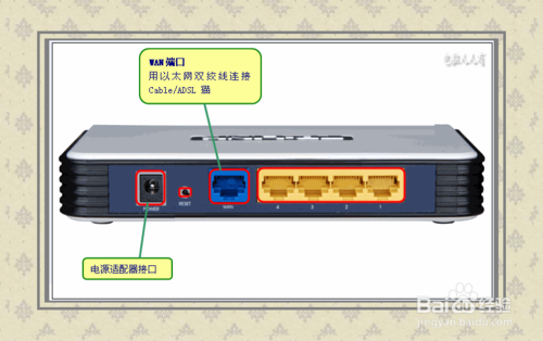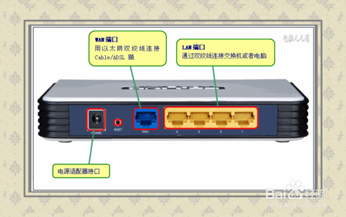3、然后將另一根網線,一頭連接路由器的LAN端口(黃色),1、2、3、4端口中的任意一個。另一頭連接電腦。正確無誤,打開電源開關,進行必要的設置。
