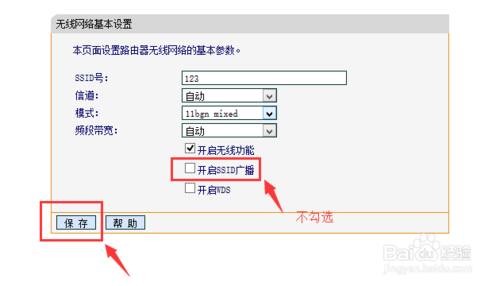 8、不勾選【開啟ssid廣播】,單擊【保存】,如下圖所示;