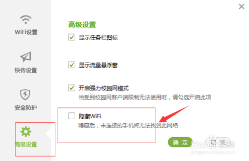 5、在高級設(shè)置里面選擇隱藏WiFi,這樣已經(jīng)連接過的手機下次不用收索也能連接了。