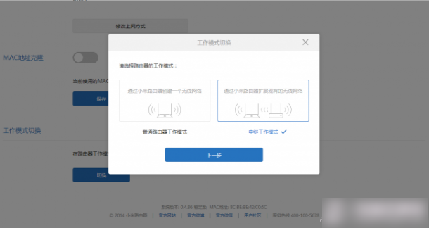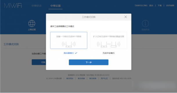 5.點擊“切換”按鈕,可以看到小米路由提供了兩種選擇:普通路由工作模式和中繼工作模式,選擇中繼工作模式。