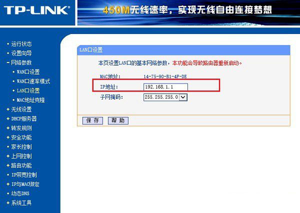 為了保障路由器后臺管理界面安全,我們首先需要修改登陸地址。登陸TP-Link路由器管理界面后,點擊左側的【網絡參數】,然后展開點擊【LAN口設置】,然后更改默認IP地址,如下圖所示。