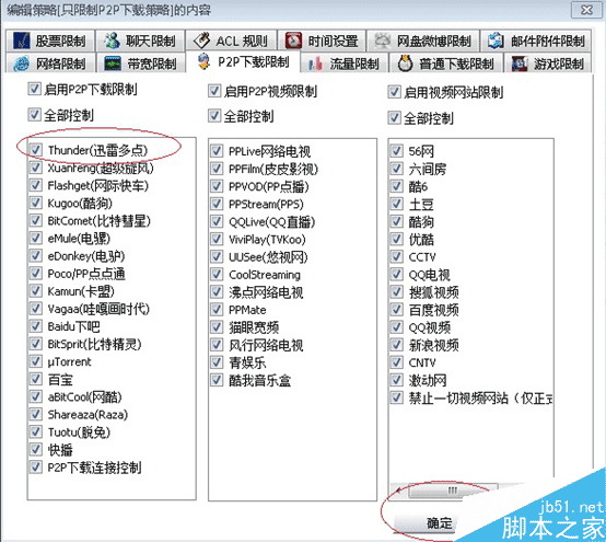 圖:聚生網(wǎng)管禁止P2P下載、禁止在線看視頻的設置。