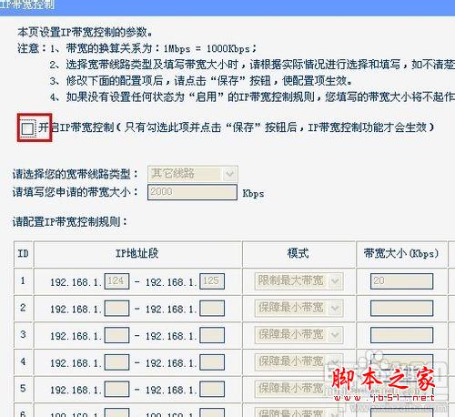 然后我們來到“IP帶寬控制”選項,我們首先要勾選“開啟IP帶寬控制”,否則不能進行下面的操作,然后選擇帶寬線路和填寫帶寬大小,這些都要如實填寫,如果自己不清楚的話,可以打電話咨詢寬帶供應商。
