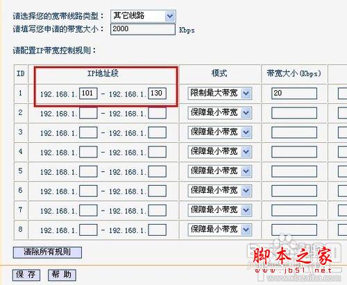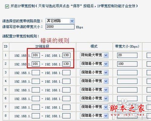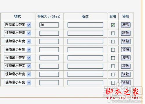 接著我們就可以來設置網(wǎng)速了。首先是填寫IP地址段,通過剛才查看“DHCP服務器”選項,我們了解到了可供上網(wǎng)總的IP地址段和已經(jīng)使用路由器上網(wǎng)的IP地址,想要限制某段的IP地址只需要填寫起始和結束的位置即可,如果想要限制單個,填寫相同的起始和結束位置即可(效果未測)。