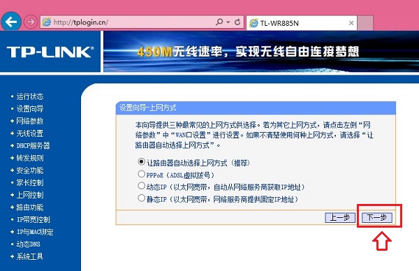 第三步:下一步會(huì)進(jìn)入“設(shè)置向?qū)?上網(wǎng)方式”的選擇,如果是撥號(hào)上網(wǎng)用戶,請(qǐng)選擇【PPPoE(ADSL虛擬撥號(hào))】,如果不確定自己寬帶類型的話,默認(rèn)選擇【讓路由器自動(dòng)選擇上網(wǎng)方式】即可,之后點(diǎn)擊下方的【下一步】,如下圖所示。