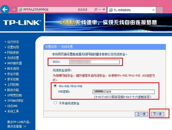 第五步:上網(wǎng)設(shè)置完成后,接下來會(huì)進(jìn)入如下【設(shè)置向?qū)?無線設(shè)置】界面,這里的SSID是指無線網(wǎng)絡(luò)名稱,大家可以默認(rèn)不填,或者填寫稱自己喜歡的名稱,如m.survivalescaperooms.com或者武林網(wǎng)家的路由器等等。接下來下面必須為無線路由器設(shè)置無線密碼,這里需要先勾選上【W(wǎng)PA-PSK/WPA2-PSK】,然后在PSK密碼后,填寫上Wifi無線密碼即可,完成后,同樣點(diǎn)擊下方的【下一步】,如下界面圖所示。
