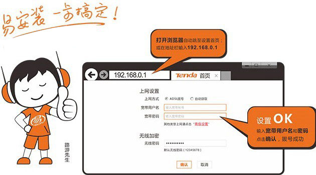 2014新款騰達無線路由器多數均采智能易安裝技術(已獲專利保護),路由器設置僅需兩步: