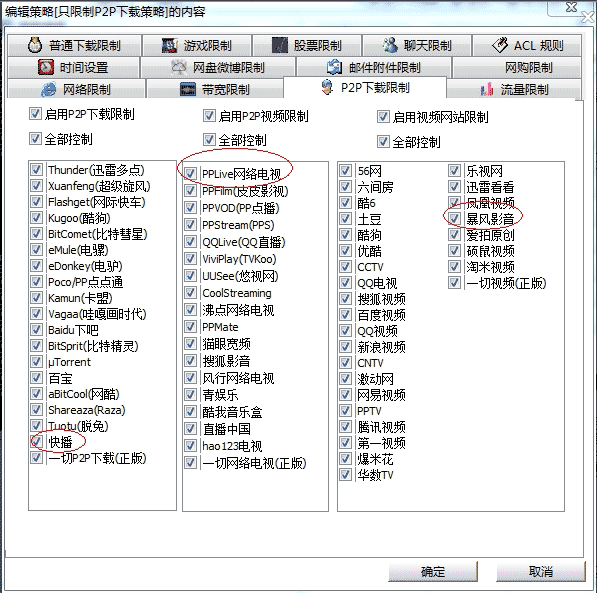 同時,借助于聚生網管你還可以禁止局域網P2P下載、禁止在線看視頻等,從而可以防止P2P軟件、在線視頻播放軟件對局域網網速的搶占,如下圖所示: