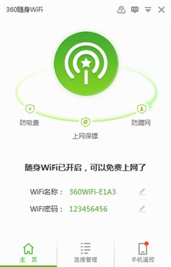 驅動安裝完畢后,會在電腦桌面的顯示一個小的浮動窗口,用于顯示簡介與移動設備連接的數量。雙擊點開后,會顯示360隨身Wi-Fi的整體運行狀態,在其中還可以對Wi-Fi名稱、密碼進行隨意的更改,加密方式可以是字母也可以是純數字,都沒有任何限制。