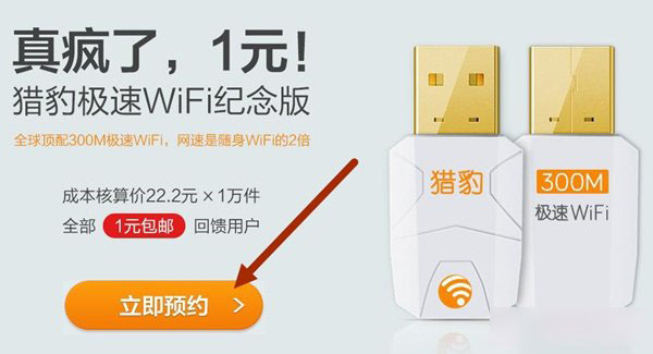 獵豹移動1元神器“獵豹極速WiFi”今天正式發布,幫助用戶解決沒有無線網卡的問題。獵豹極速WiFi即將于5月21號正式上市開賣,屆時將會有多少件上市,官網沒有明確說明,但是肯定是多余1萬件的,因為獵豹官網說明了前1萬件獵豹極速WiFi只要花1元就可以買到,還是包郵的哦。獵豹極速WiFi今天已經在其官網開啟了預約購買。那么獵豹極速WiFi怎么預約?以下武林網小編為大家詳細介紹下獵豹極速WiFi預約購買方法。