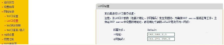 然后點【LAN口設置】,把右側的IP地址改成192.168.2.1,點保存。