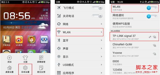l 點擊智能手機的菜單按鈕,選擇系統(tǒng)設置,在設置菜單中選擇WLAN。打開WLAN功能后,選擇無線路由器信號的名稱: