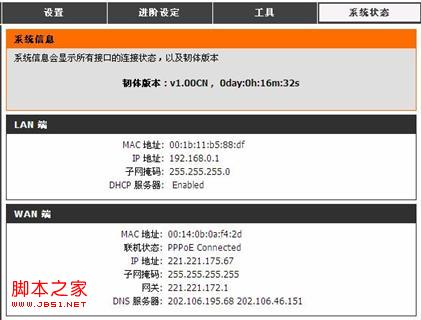 在系統狀態界面中看到PPPoE已經連接上,且路由器的WAN端也獲取到了由電信部門分配的IP地址信息。