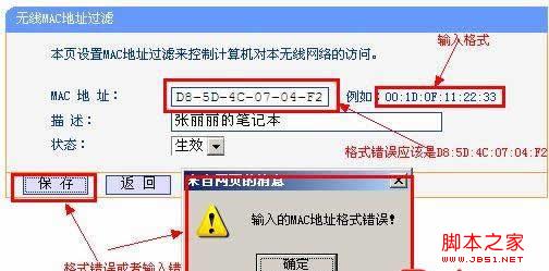 注意:以上圖設置格式不對,因為路由器的不同,其設置MAC網址的格式也不一定的。具體可以看他例如:后面寫的格式。所以d8-5d-4c-07-04-f2格式是不對的,應該是d8:5d:4c:07:04:f2才對的。否則連保存都做不到的。