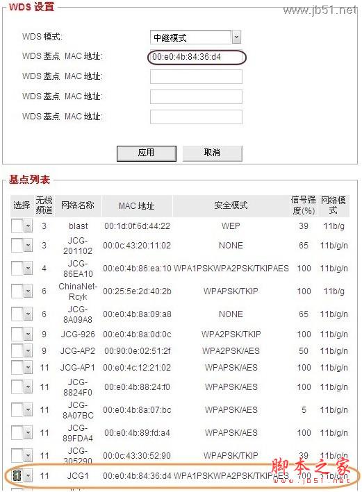 進(jìn)入路由器的管理界面——高級(jí)設(shè)置——無(wú)線設(shè)置——WDS設(shè)置——WDS模式(中繼模式) 點(diǎn)掃描,搜索到前面主路由器的SSID,選擇1,如果提示更改頻道,點(diǎn)確定。查看對(duì)應(yīng)主路由器的MAC是否已經(jīng)填入到WDS基點(diǎn)MAC地址里面,點(diǎn)應(yīng)用保存設(shè)置。