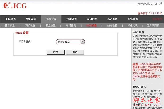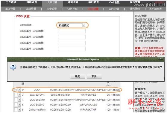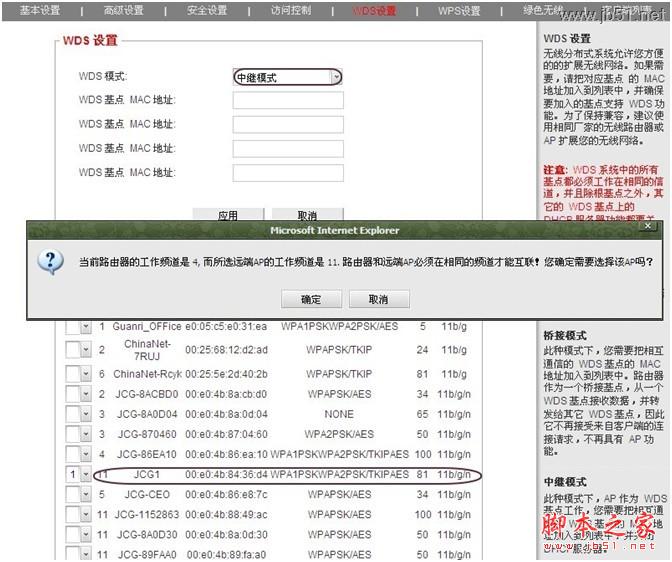 1. 進(jìn)入路由器的管理界面——高級(jí)設(shè)置——無(wú)線設(shè)置——WDS設(shè)置——WDS模式(橋接模式) 點(diǎn)掃描,搜索到前面主路由器的SSID,選擇1,如果提示更改頻道,點(diǎn)確定。查看對(duì)應(yīng)主路由器的MAC是否已經(jīng)填入到WDS基點(diǎn)MAC地址里面,點(diǎn)應(yīng)用保存設(shè)置。