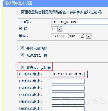 選擇無線設置,在Bridged的前打鉤,將另外一個路由的MAC地址輸入(MAC地址在路由器底部有表示)