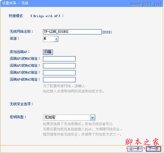 注:在TL-WR703N在選擇橋接模式(Bridge with AP),支持的加密類型如下:WEP、無加密、不修改無線安全設置。(此例選擇WEP進行無線加密)