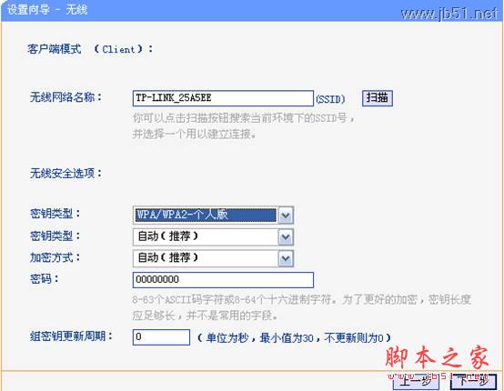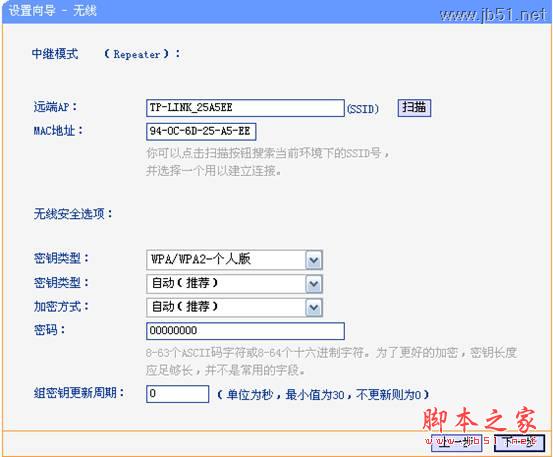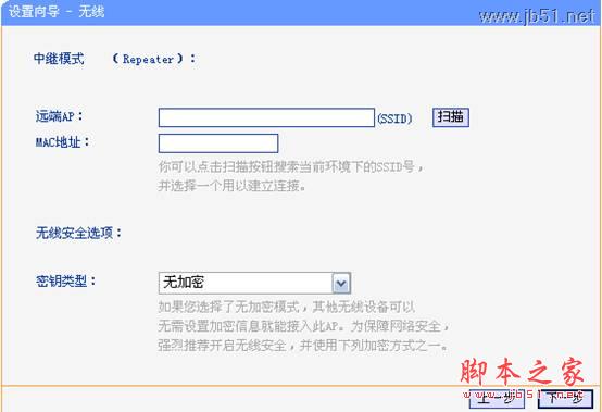 步驟2:填入遠端AP的ssid、mac地址或者點擊掃描,在彈出的列表當中選擇要中繼的前端路由器的SSID號進行連接,并輸入與前端路由器相同的加密類型及密鑰。