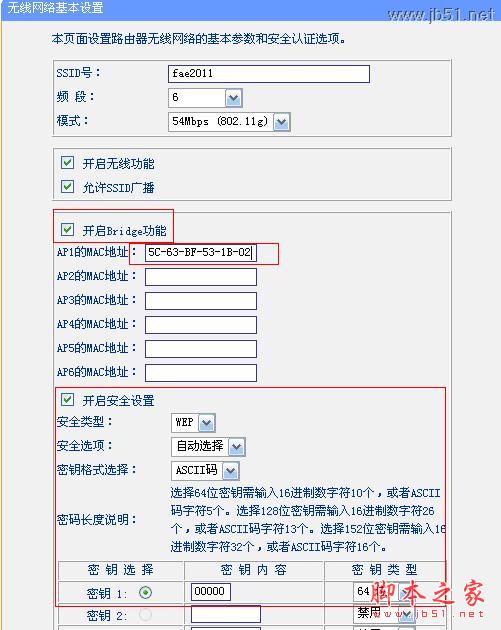 下圖為TL-WR541G+的操作界面, 設置無線參數,指定信道為6,開啟bridge功能且填上橋接對端TL-WR703N的設備MAC地址,并開啟安全設置,如下圖所示: