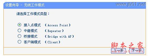 步驟4:點擊“下一步”開始設置,彈出工作模式設置頁面,選擇“無線AP模式”如下圖所示。
