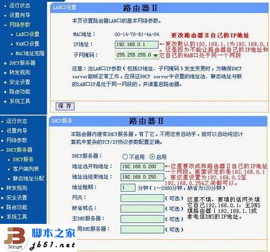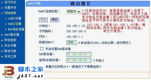 2、路由器2的設置,主要是更改WAN 口地址,更改LAN 口地址,更改DHCP 地址范圍,路由器設置的WAN 口為動態IP 以便從第一個路由器那里獲得IP 地址,更改它自己的IP 地址和DHCP 到另一個網段去使之與第一個路由器不在同一個網段,如下圖所示:
