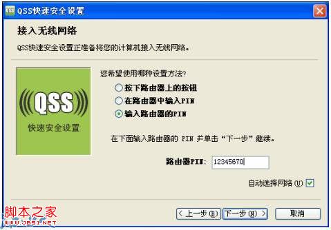 如果路由器已經有新的PIN 碼時,請在路由器管理界面的QSS安全設置界面中讀取當前PIN碼填在下圖中的路由器PIN后面的方框中。