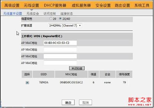 2、如果知道對端騰達無線路由器無線MAC地址,則可以直接在AP MAC地址欄填入對端無線MAC地址,也可以通過掃描,搜索到對端無線騰達無線路由器的信號,點擊開啟掃描選擇掃描到的信號,并點擊確認,會自動添加相應無線信號的MAC地址。