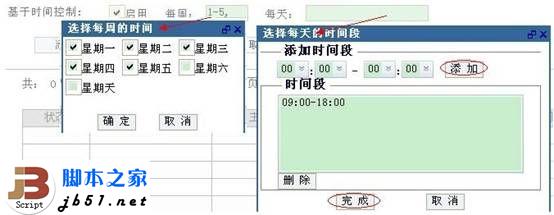 4、在基于時間控制欄,勾選上啟用,會在右側彈出時間框,在每周內容框中勾選上周一到周五,并確定,在每天內容框中添加一個9:00-18:00點的時間段并點擊。