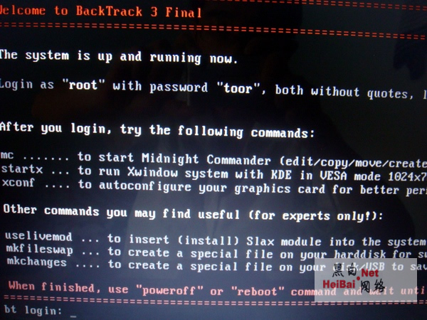 BT3啟動過程。用戶名root,密碼toor,輸入startx啟動圖形界面。