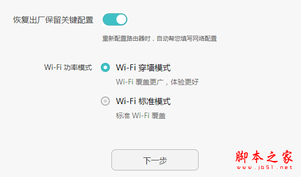5、在跳轉(zhuǎn)的頁面中啟用:恢復(fù)出廠保留關(guān)鍵配置 這個(gè)功能 ——> Wi-Fi功率模式 選擇:Wi-Fi穿墻模式 ——> 點(diǎn)擊:下一步,如下圖所示。