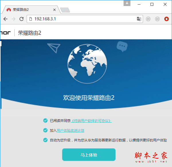 2、此時(shí),在電腦的瀏覽器中,系統(tǒng)會(huì)自動(dòng)打開設(shè)置頁面。如果未自動(dòng)打開,請(qǐng)?jiān)跒g覽器中輸入:192.168.3.1打開設(shè)置界面,然后點(diǎn)擊:馬上體驗(yàn) 。