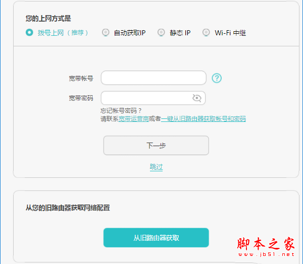 3、路由器會(huì)自動(dòng)檢測(cè)你家寬帶的 上網(wǎng)方式,稍微等待幾秒鐘,根據(jù)檢測(cè)結(jié)果設(shè)置正確的上網(wǎng)參數(shù)。