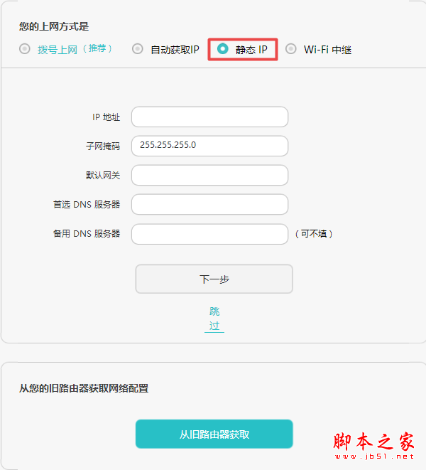 (3)、如果檢測(cè)到上網(wǎng)方式是:靜態(tài)IP ——> 你需要在頁面中,填寫運(yùn)營商提供的 IP地址、子網(wǎng)掩碼、默認(rèn)網(wǎng)關(guān)、首選DNS、備用DNS ,如下圖所示。