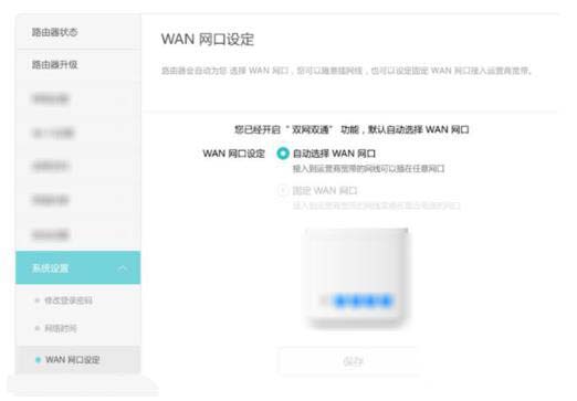 點擊更多功能 > 系統設置 > WAN 網口設定,在 WAN 網口設定區域中選擇固定 WAN 網口,再點擊保存即可關閉網口盲插功能。如果您想重新開啟,選擇自動選擇 WAN 網口并點擊保存即可。