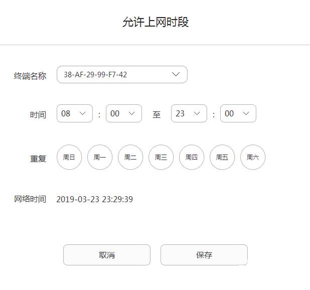 4、然后選擇允許上網的終端,即上網的手機或者電腦,然后設置允許上網時間,最后保存即可