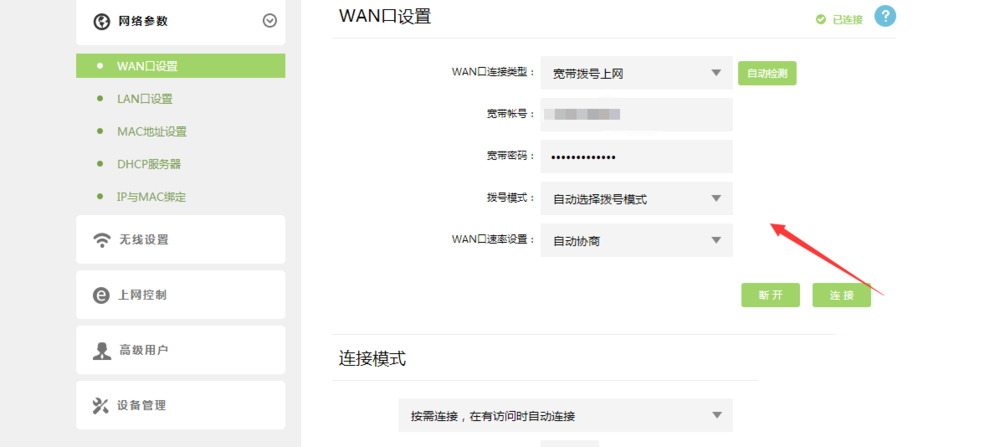 3、接著直接進行設置,點擊右上角的【高級】——【WAN口設置】——輸入上網賬號和密碼,然后連接接。
