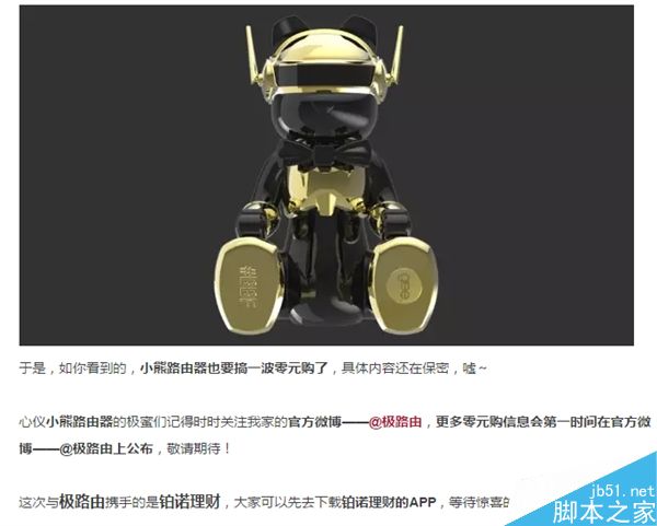 現(xiàn)在極路由官方宣布,之前推出的599元小熊路由器也要搞一波“0元購(gòu)”,這次與極路由攜手的是鉑諾理財(cái),0元購(gòu)信息會(huì)第一時(shí)間在官方微博——@極路由上公布。