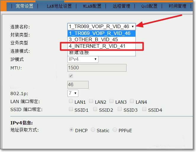 3、在連接名稱上選擇INTERNET_B_VID_41,注意41這個值各地方有所不同,只要是INTERNET開頭的就可以了,不建議新建連接。