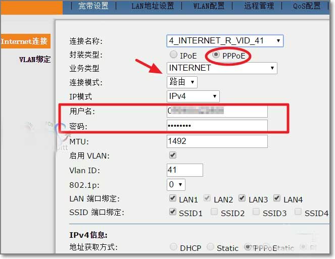 4、封裝類型選PPPoE,連接模式選擇成路由;選過以后在最下面會再多出用戶名和密碼的輸入框,輸入自己的寬帶帳號和密碼,其它設置默認不動。